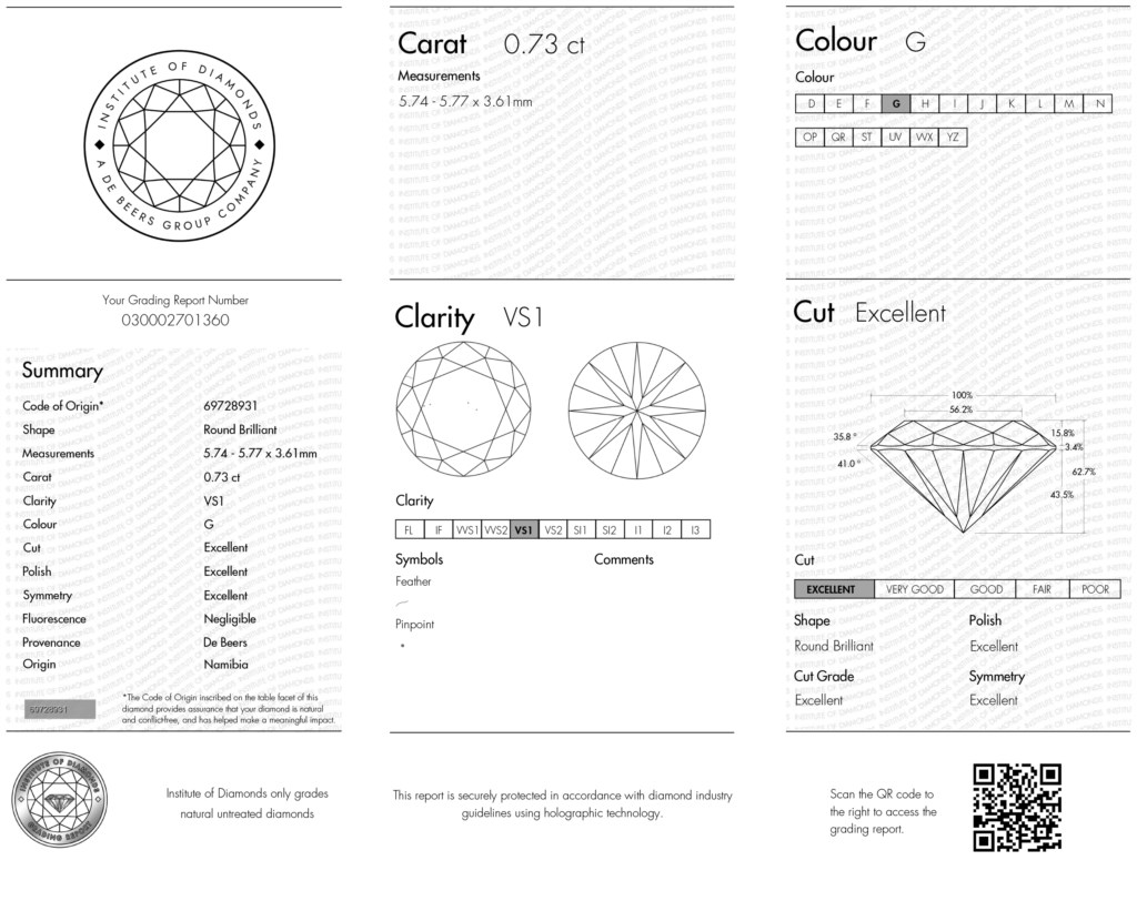 Each De Beers Origin Diamond includes a De Beers Origin inscription on the Diamond. The inscription is less than 1/5000th of a huma…