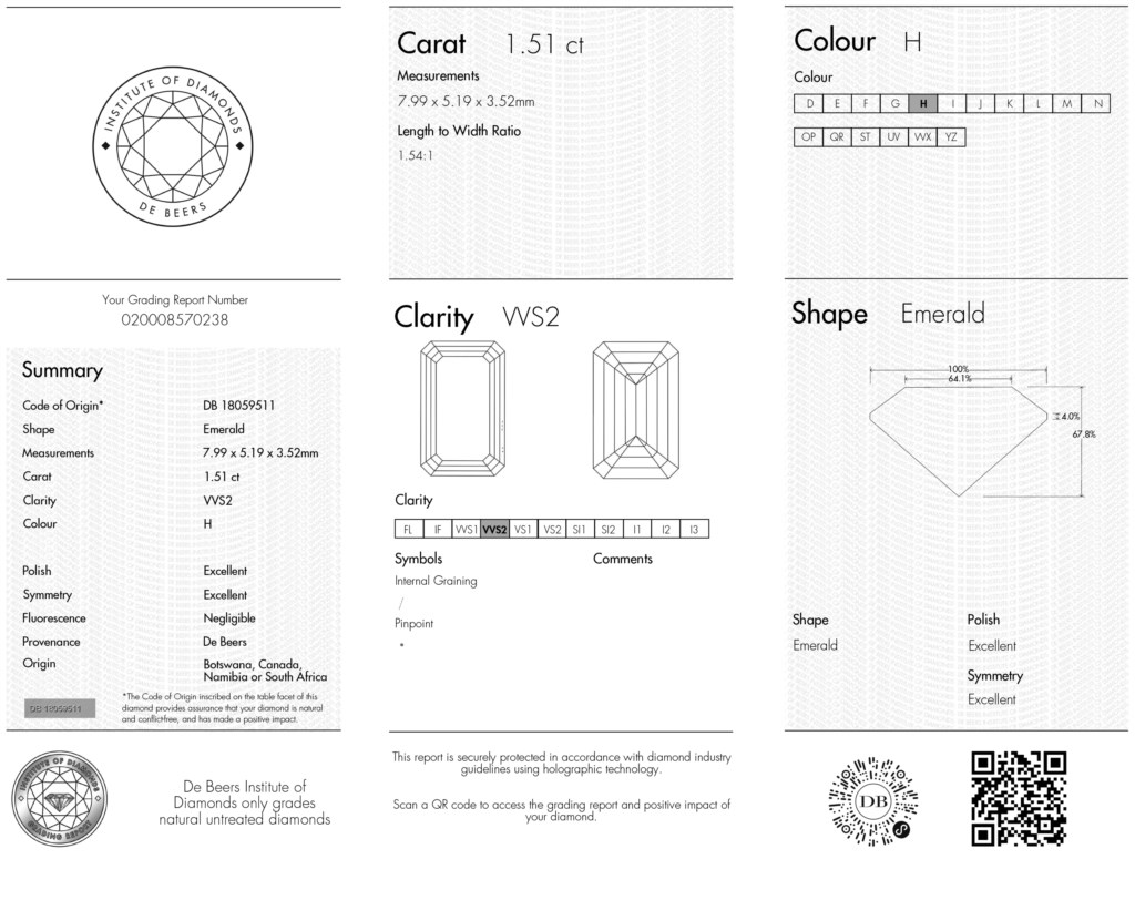 This diamond features a De Beers Code of Origin inscription. The inscription is less than 1/5000th of a human hair in thickness. The Code of Origin provides you the full journey of the diamond, how it was formed, where it was mined, what it looked like before cutting and polishing, and the positive impact your diamond has had on the lives of the community where it was mined, as well as our planet.