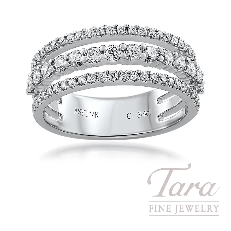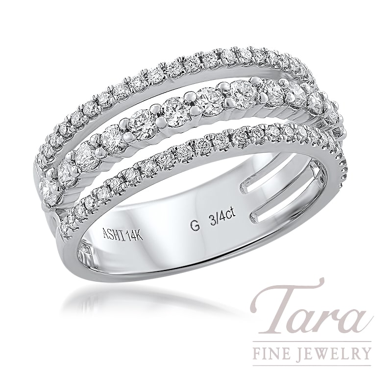 Both elegant and graceful, this Diamond Fashion Ring in 14K White Gold will make her eyes sparkle with joy! With a beautiful three-row design consisting of 64 twinkling Round Diamonds at 0.75TDW, this incredible fashion ring will be the perfect addition to her fabulous collection of fine jewelry!