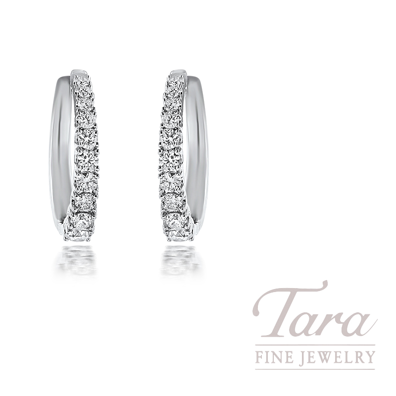 Show the world your dashing sense of style with these glamorous 14K White Gold Eternity Diamond Hoop Earrings! Crafted from radiant 14K White Gold, with 20 sparkling Round Diamonds 2.00TDW, these stunning Earrings display an intriguing inside out design, with Natural Diamonds flanking the inner and outer rims. Measuring 1/2″ diameter with a weight of 8.2G, such lightweight Earrings for comfort fit. Bask in true brilliance when you put on these fun 14K Yellow Gold Eternity Diamond Hoop Earrings, as they easily transition from day to night!