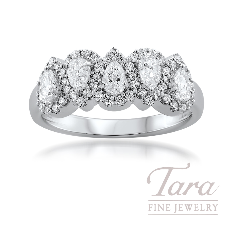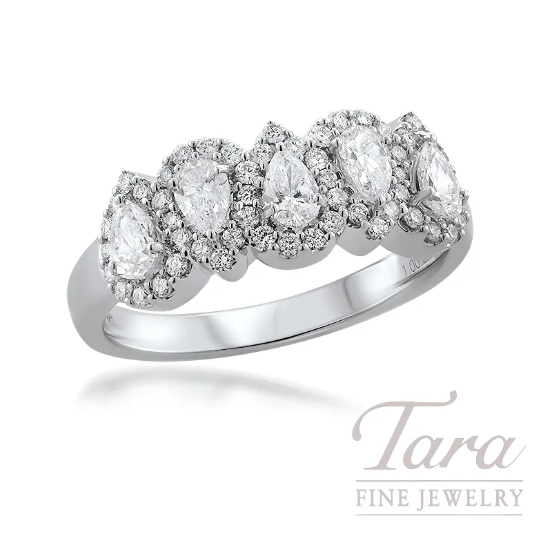 Both elegant and graceful, this lovely 14K White Gold Diamond Ring will make her eyes sparkle with joy! With 5 gleaming Pear Shape Diamonds, and 53 twinkling Round Diamonds at 1.00TDW, a ring for all occasions. Set in brilliant 14K White Gold, this striking vintage style Ring is the perfect addition to her fabulous collection!