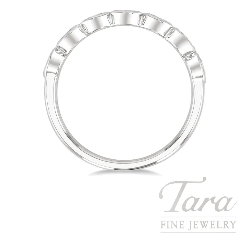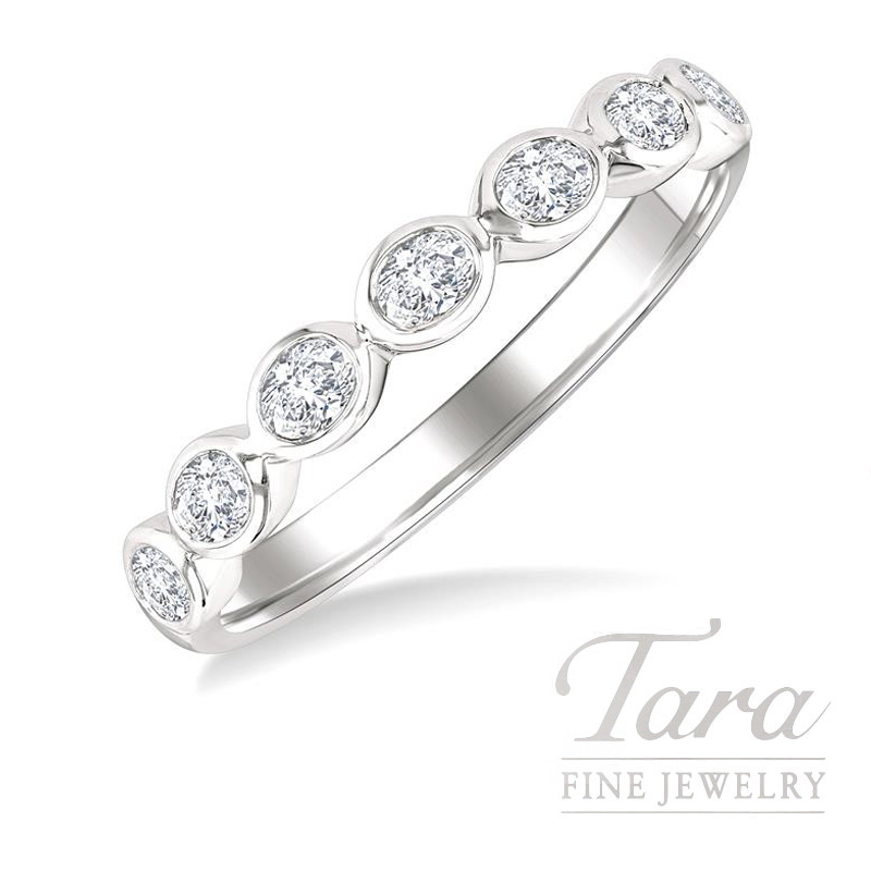 Discover the perfect blend of modern design and timeless luxury at Tara Fine Jewelry Company, with this 14K White Gold East-West Diamond Band. This sophisticated Ring features 7 brilliant Oval Diamonds at .70TDW, set horizontally in a sleek bezel mounting for a unique contemporary aesthetic. Each Diamond is carefully secured within the polished precious metal to create a smooth and snag free surface that is ideal for daily wear. Weighing 2.6G of superb 14K White Gold, this substantial yet delicate Band provides a continuous stream of radiance that elegantly wraps around the finger. Whether worn as a standalone statement piece or paired with an engagement ring as a modern wedding band, thi…