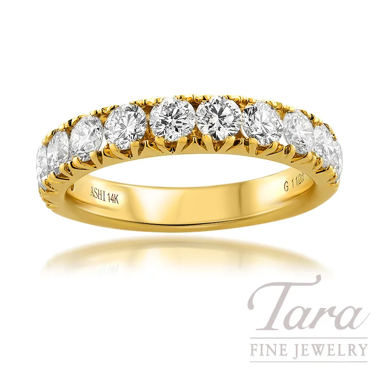 Embrace a classic and luxurious sense of style with this Elegant 14K Yellow Gold Diamond Band showcased at Tara Fine Jewelry Company. This gorgeous Diamond Band promises timeless beauty and elegance, making it the perfect matching band to your stunning Diamond Engagement Ring. This beautifully crafted Band is fashioned from vibrant 14K Yellow Gold with a brilliant polish finish. Sure to bring its own dazzling beauty, the Ring features 11 sparkling Round Diamonds at 1.50TDW in a classic half-eternity style. Timeless in style and radiant in beauty, you will forever treasure the radiant light that this elegant Diamond Band brings to your Wedding Set.