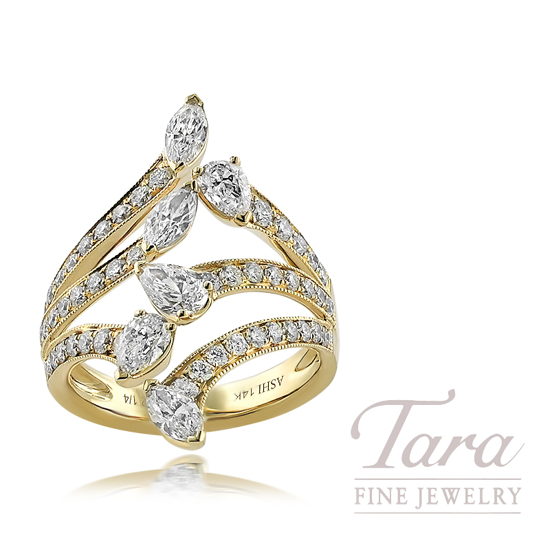 You will adore the sparkle of this unique 14K Yellow Gold Diamond Ring! When it comes to trendsetting Diamond Rings, there is no better jeweler than Tara Fine Jewelry Company. This eclectic Ring is crafted in a branch like pattern of 14K Yellow Gold with an array of various shaped twinkling Diamonds at 2.25TDW. Such a wave of dashing sparkle to flow over your finger!