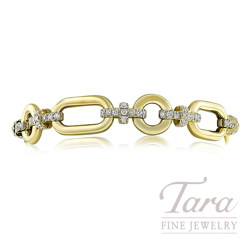 With its golden glow, this chic 14K Yellow Gold Diamond Bracelet delivers endless sparkle for a very special lady! At 26.7G, this exquisite Diamond Bracelet measures 7″ in length with a chic fancy link pattern. Designed with 77 Round Natural Diamonds at 2.60TDW, this Bracelet is indeed a ray of sunshine to adorn your wrist for casual or formal dress.