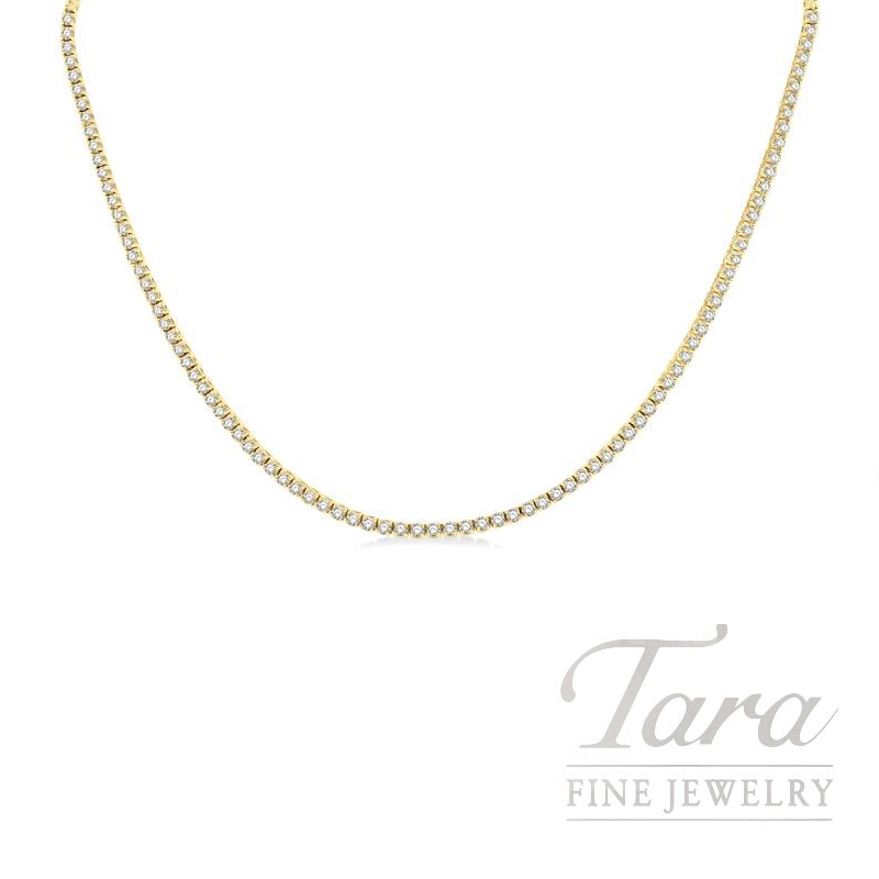 Discover this stunning 14K Yellow Gold Diamond Tennis Necklace at Atlanta’s premier jeweler, Tara Fine Jewelry Company. Showcasing 159 Round Diamonds at a substantial 7.0CT TW, this alluring Diamond Necklace is expertly crafted with 19.1G of radiant 14K Yellow Gold. At 16″ length, the Necklace rests gracefully at the collarbone providing a continuous stream of glowing brilliance. Each Diamond is secured in a classic four prong setting. This luxurious Diamond Tennis Necklace represents the pinnacle of sophistication. Elevate your personal style with this timeless 14K Yellow Gold Diamond Tennis Necklace, the embodiment of harmony, luxury and classic craftsmanship.
