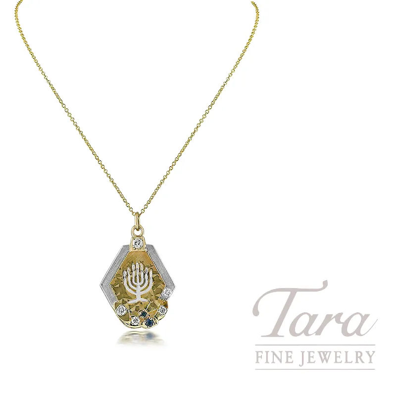 Like a ray of light, this timeless Menorah Pendant is an enduring symbol of light, wisdom and holy presence. Crafted from the precious metal of 14K Yellow Gold, the beauty of this lovely Pendant is accentuated with 5 Round Diamonds .28TDW and 2 Blue Sapphires .08TGW. At 8.3G, and equipped with an 18″ Cable Chain Necklace, this enduring 14K Yel…