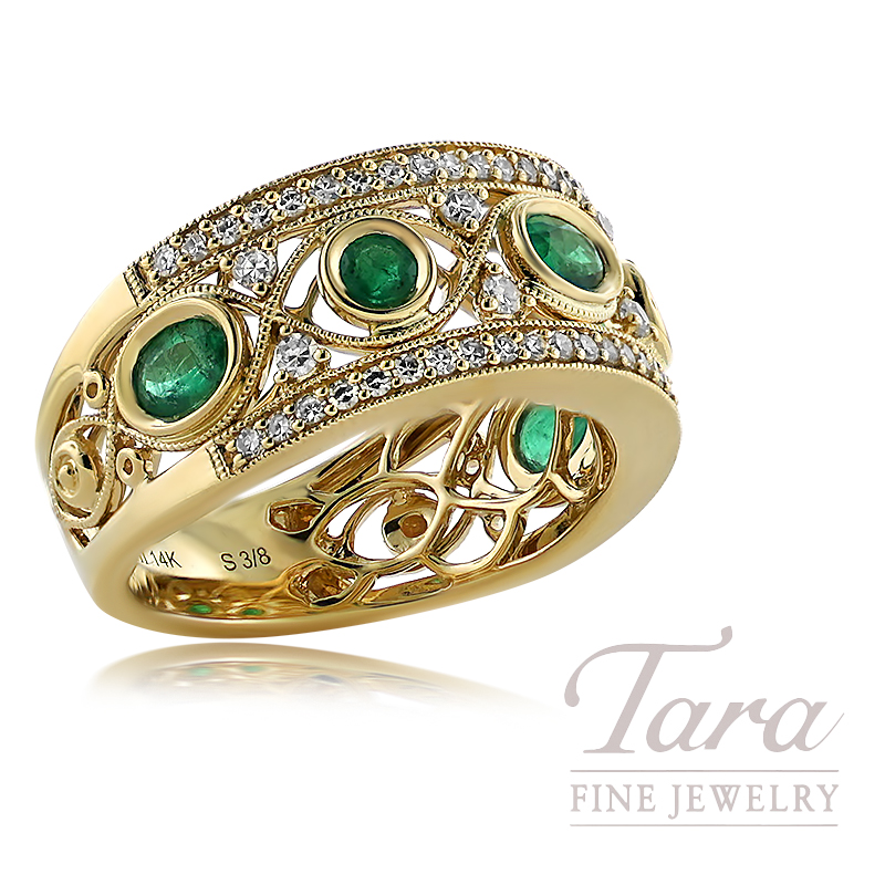Royal and regal is the theme of this magical 14K Yellow Gold Emerald Diamond Ring. As stately as fine royalty, this gorgeous Diamond Emerald Ring is captivating! With fancy cut Emerald Gemstones in a unique blend of Oval and Marquise design, the lush green Emeralds inspire richness and prosperity while yielding a sense of calm elegance. At 6.2G, the timeless precious metal of 14K Yellow Gold radiates as the foundation of this alluring tapered Ring, while 56 Round Diamonds of .40CT TW accentuate its enchanting nature.