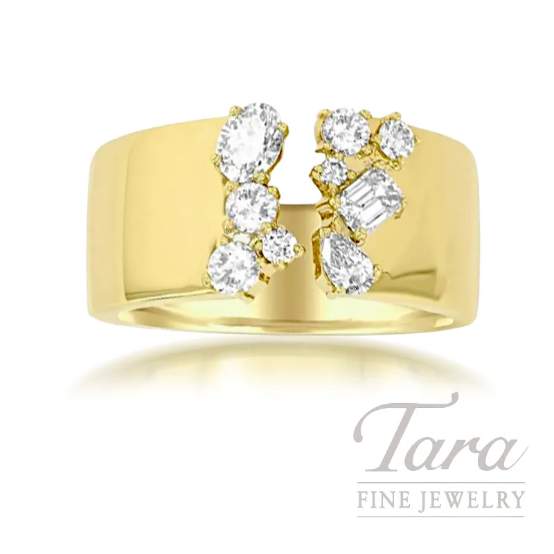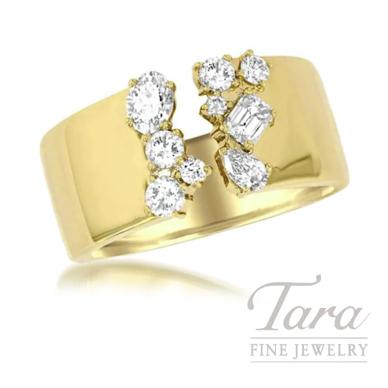 Such a chic and contemporary design in this 14K Yellow Gold Diamond Open Cuff Ring! The radiance of this unique Ring is achieved by the precious metal foundation of 14K Yellow Gold. The open cuff is rimmed with Natural Diamonds of varying shapes at 0.75TDW. What a fun design to highlight your look, day or night!