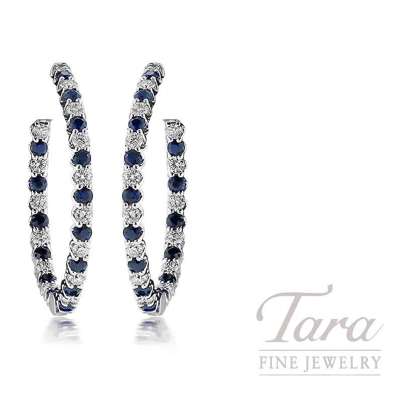Show the world a dazzling sense of style with these glamorous 14K White Gold Sapphire Diamond Hoop Earrings! Crafted from radiant 14K White Gold, with 28 sparkling Round Diamonds 1.50TDW and 30 rich Blue Sapphires, at 2.3MM these lovely Earrings feature an intriguing inside out design. Bask in true brilliance when you put on these fun 14K White Gold Inside Out Diamond Hoop Earrings, as they easily transition from day to night!
