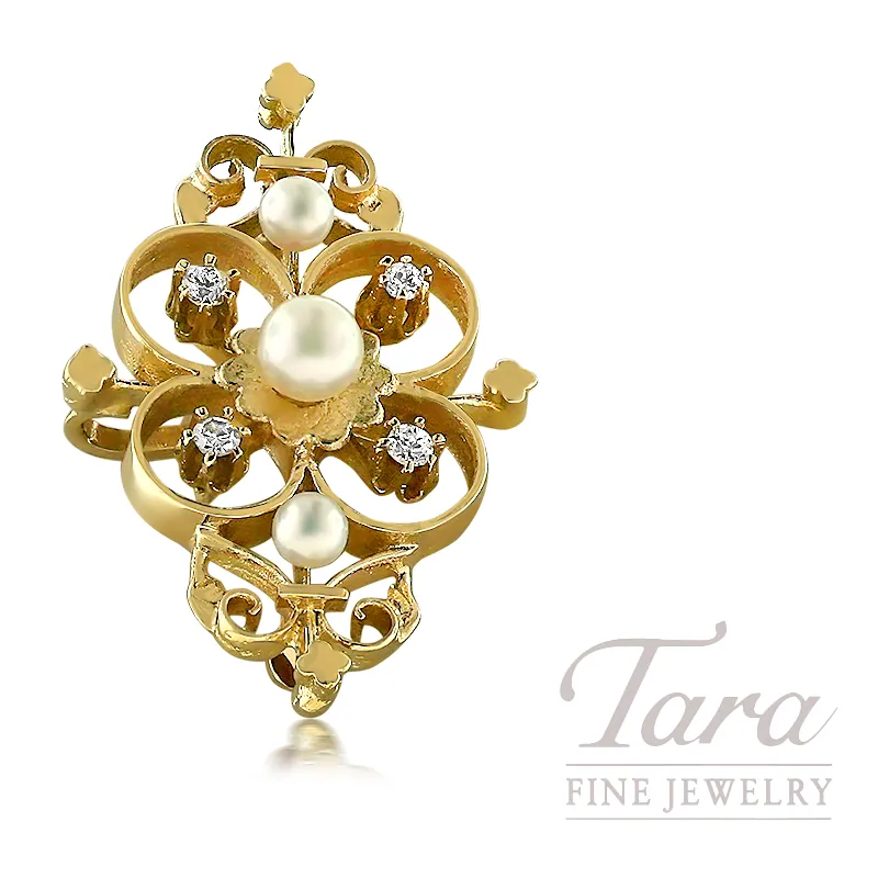Timeless and true, this 14K Yellow Gold Pearl and Diamond Brooch blends the best of traditional and contemporary design. With its filigree style pattern throughout, this distinguished Brooch features 4 gleaming Round Diamonds and 3 luminous Round Pearls. This vintage treasure is an everlasting keepsake to pass on from generation to generation.
