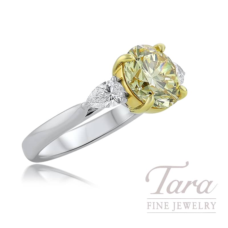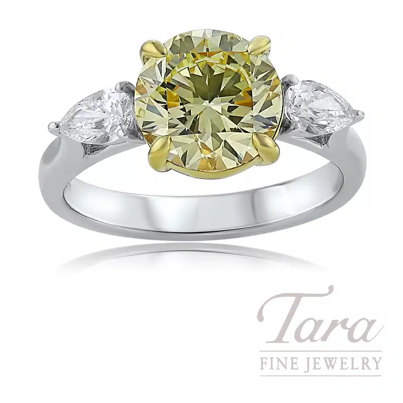 Command attention and celebrate extraordinary rarity with this magnificent GIA certified 18K White and Yellow Gold 3-Stone Diamond Ring showcased at Tara Fine Jewelry Company. A masterpiece of light and color, the breathtaking center features a Natural Fancy Yellow Round Brilliant Cut Diamond, at a generous 2.98CT. Radiating a deep golden glow from every facet, this center Gemstone is securely held by 18K Yellow Gold prongs that seamlessly blend with its sunny hue, while 2 icy pear shaped White Diamonds flank the center at .51CT. Crafted with a premium 18K White Gold Band for a sleek and modern feel, this Diamond Ring represents a significant investment in high quality Natural Diamonds and expert jewelry design. Perfect for an unforgettable engagement or a landmark anniversary, this certified Fancy Yellow Diamond Ring ensures a presence of unparalleled luxury and sophistication!