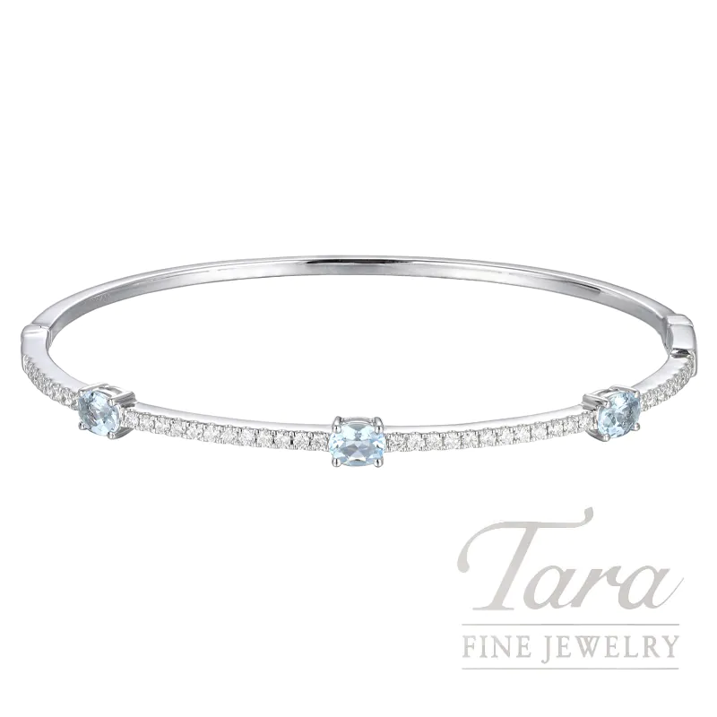 Embrace the luminous elegance of this exquisite 18K White Gold Bangle Bracelet showcased at Tara Fine Jewelry Company. The cool brilliance of Natural White Diamonds is paired with the serene beauty of Aquamarine Gemstones. Expertly crafted in shimmering 18K White Gold, this sophisticated Bangle is adorned with 0.51TDW, along with 3 stunning Oval Aquamarine Gemstones totaling 0.84 carats. With a bezel set design, the celestial blue Aquamarines perfectly complement the sparkling Diamond accents. With a substantial weight of 10.45G, this gorgeous Bangle excels in luxury and durability. Whether worn alone as a statement accessory, or stacked with other fine jewelry pieces, this versatile Diamond Aquamarine Bangle delivers a graceful presence on the wrist.