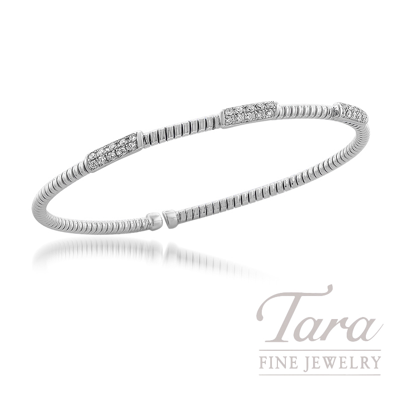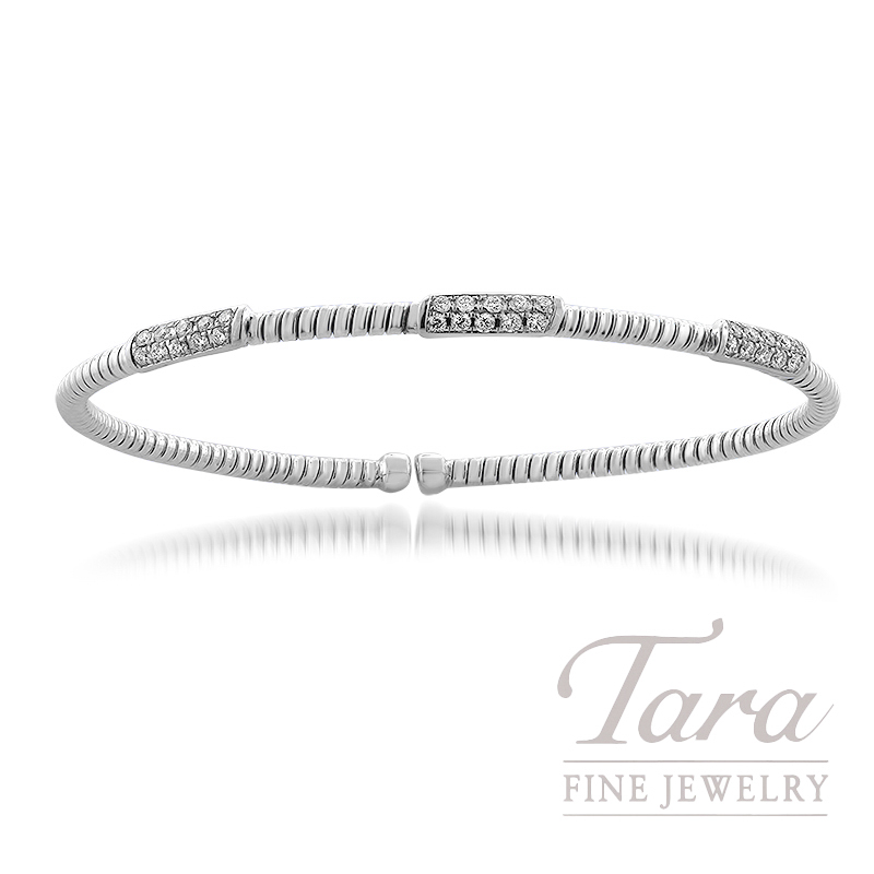 Enhance your fine jewelry collection with this exquisite 18K White Gold Diamond Bangle showcased at Tara Fine Jewelry Company. Featuring a sophisticated textured design, this elegant Diamond Bangle is crafted with shimmering stations set with 30 brilliant Round Diamonds at .40TDW. Every Diamond is carefully selected and set to capture light from every angle ensuring a radiant glow on your wrist. The sleek ribbed 18K White Gold banding offers a contemporary aesthetic that is perfect for layering with other bracelets or wearing as a standalone piece. At 5.1G, this 18K White Gold Diamond Bangle is designed for effortless comfort and lasting durability. Its timeless appeal makes it a wonderfu…