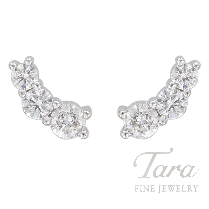 Elevate your jewelry collection with these exquisite 18K White Gold Diamond Crawler Earrings. Designed to gracefully follow the natural curve of the earlobe, these stunning climbers feature 6 hand selected brilliant Round Diamonds totaling .35TDW. Each Diamond is meticulously secured in a shared prong setting to maximize light reflection and brilliance. At 1.37G, the high polish 18K White Gold provides a sleek and luxurious finish that enhances the icy radiance of every Diamond. Perfect for a modern curated ear or a sophisticated solo statement, these versatile Diamond Crawler Earrings offer a secure comfort fit for all day wear.