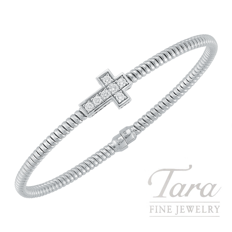Discover this exquisite 18K White Gold Diamond Cross Bracelet at Tara Fine Jewelry Company. Combining spiritual meaning with contemporary luxury, the Bracelet features a flexible tubogas style band crafted from 7.6G of premium 18K White Gold for a comfortable substantial feel. At its center, a polished cross holds 7 brilliant Round Diamonds totaling .30CT. This refined Bracelet offers a radiant sparkle and a high polish finish, making it a perfect statement of faith and elegance for any occasion.