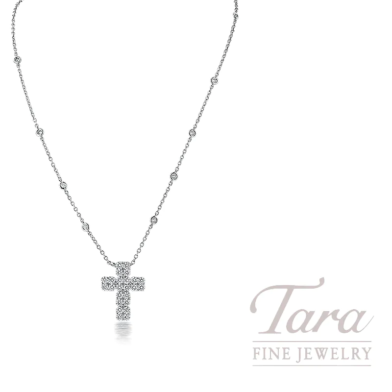 Nothing is more lovely than this 18K White Gold Diamond Cross Necklace, a timeless piece to accentuate your jewelry wardrobe! You are sure to adore this beautiful Diamond Cross Pendant, crafted from brilliant 18K White Gold in an inspiring cross design. A true classic, the Pendant Necklace features 42 Round Diamonds at 1.91TDW in a station pattern. At 5.04G, this glorious Diamond Cross Pendant Necklace promises to add joy to your fine jewelry collection!