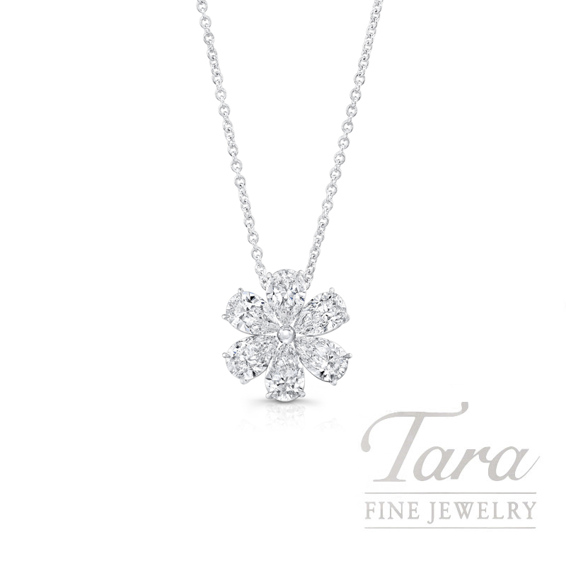 Embrace a blooming display of brilliance with this captivating 18K White Gold Diamond Flower Pendant Necklace, featured here at Tara Fine Jewelry Company. Expertly crafted to resemble a shimmering flower blossom, this Necklace displays 6 pear shaped Diamonds that radiate outward from a central polished gold point. Each exceptionally cut Diamond contributes to a substantial 4.21CT TW, creating a bold sparkle that commands attention. Weighing 5.9G, the Diamond Pendant is suspended from a 16-18″ adjustable 18K White Gold Cable Chain, for perfect placement on any neckline. This floral inspired design blends organic elegance with fine craftsmanship, making it a versatile addition to any collec…