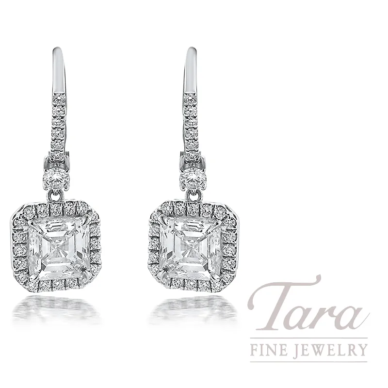 Nothing can top the standout beauty of these gorgeous Diamond Halo Drop Earrings! From our Tara Luxe Collection, these brilliant Diamond Earrings are crafted from 18K White Gold. The timeless design of 54 twinkling Round Diamonds .34CT TW framing two GIA Certified Asscher Cut Natural Diamonds 4.01CT TW, accentuates the magnificence of these Diamond Earrings. What a wonderful addition to your fine jewelry collection, a treasure for today and always!