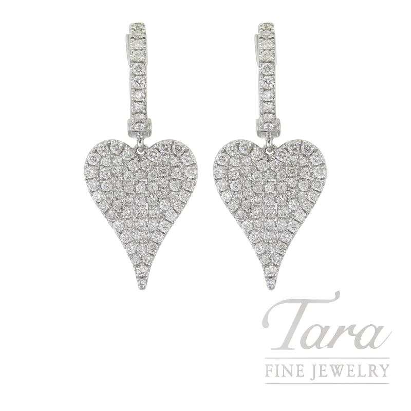 Discover the essence of romantic luxury with these 18K White Gold Diamond Heart Dangle Earrings. This sophisticated pair of Earrings feature an elongated Heart silhouette meticulously pavé set with 150 brilliant Round Diamonds totaling .60CT TW. Suspended from Diamond accented leverback hoops, at 3.07G these remarkable Diamond Earrings offer a seamless flow of radiance and secure fit. Crafted in high polish 18K White Gold, these exquisite Diamond Drop Earrings serve as a modern tribute to classic love paired with contemporary design.