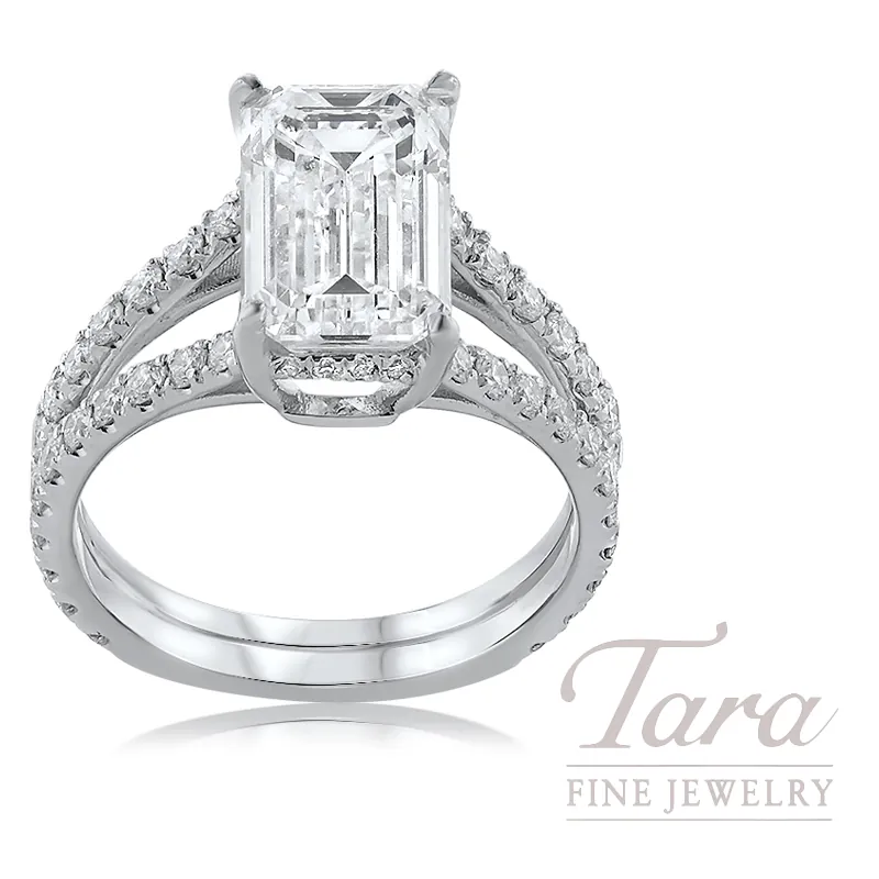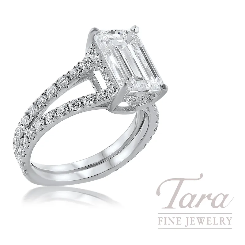 Fall in love with this 18K White Gold Diamond Engagement Ring Setting today! Crafted in brilliant 18K White Gold, this split shank Diamond Engagement Ring Setting gleams with class and beauty! Adorned with 66 Round Diamonds at 1.01TDW, the setting showcases a magnificent Emerald Cut Natural Diamond of 3.20CT with a color and clarity of I-IF (*sold separately). She will fall in love all over again with the incomparable beauty of this radiant Diamond Engagement Ring Setting!