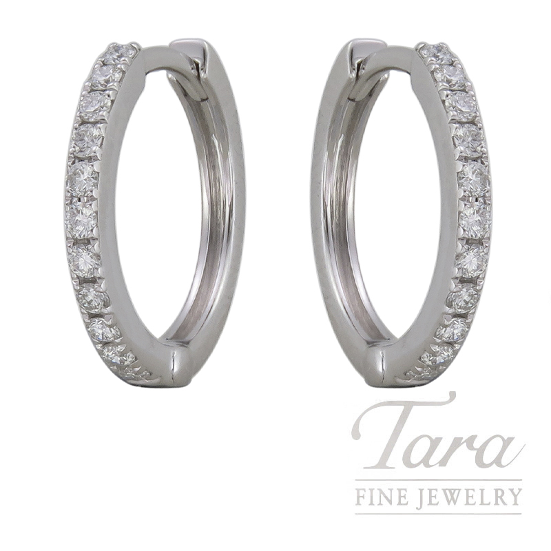 Exude timeless elegance with these stunning 18K White Gold Diamond Hoop Earrings showcased here at Tara Fine Jewelry Company. Featuring 22 brilliant Round Diamonds at 0.24TDW, this sophisticated pair of Diamond Earrings catches the light from every angle, against the high polish White Gold finish.