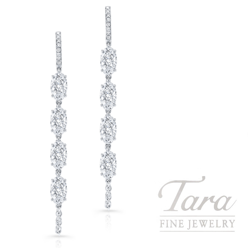 Capture the essence of sophisticated glamour with these stunning 18K White Gold Diamond Chain Earrings from Tara Fine Jewelry Company. Unlike mass produced accessories, these exquisite Diamond Earrings are handcrafted to ensure superior quality and timeless beauty. These elegant Diamond Drop Earrings feature a modern design that combines the brilliance of 8 Moval Diamonds – a creative fusion of Moval and Oval Cut Diamonds – with the sparkle of 16 Round Diamonds at 2.89TDW. Crafted from 18K White Gold and weighing 4.4G, these 18K White Gold Diamond Huggie Chain Earrings offer graceful movement that will illuminate your features with every turn.