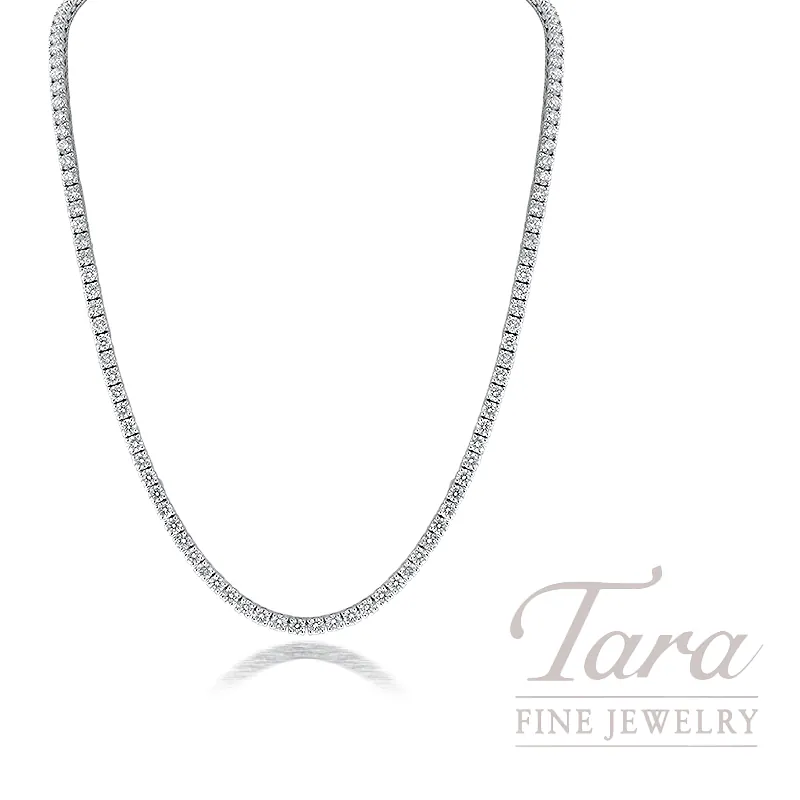 From our Tara Luxe Collection, Tara Fine Jewelry Company is proud to feature this gloriously magnificent 18K White Gold Diamond Tennis Necklace. At a generous weight of 24.5G, this dazzling Diamond Tennis Necklace is 17″ long. Crafted in a timeless tennis design, from the precious metal foundation of 18K White Gold, the Necklace features 131 Natural Round Diamonds at 13.72TDW. Diamonds are Fore…