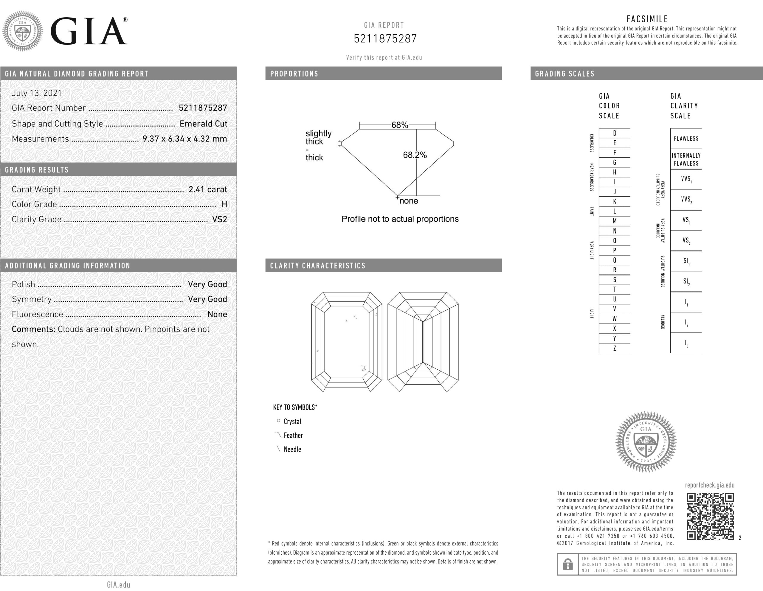 Diamond Center Stone 2.41CT. Emerald Cut Diamond, H-VS2 #190-01983: $65,000