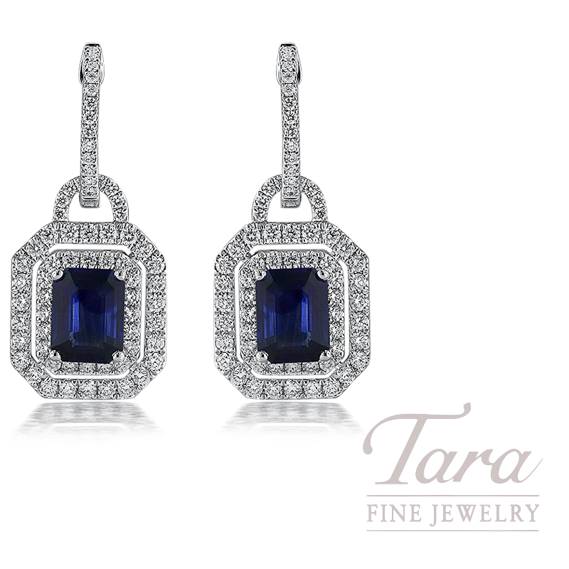 18K White Gold Emerald Cut Blue Sapphire Diamond Halo Drop Earrings 3.86TGW, 1.27TDW