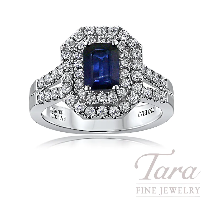 Discover the pinnacle of sophistication with this masterfully designed 18K White Gold Double Halo Ring, featured at Tara Fine Jewelry. This exquisite Ring features a 1.37CT Emerald Cut Sapphire radiating a deep and captivating blue hue. A breathtaking double halo of 78 Round Brilliant Diamonds surrounds the Sapphire and extends onto the split shank band for a total weight of 0.95CT. Weighing 7.44G, this exotic Sapphire Diamond Ring offers a substantial and luxurious feel for daily wear or special occasions. This stunning Sapphire Diamond masterpiece serves as a definitive statement of elegance and a premier choice for those seeking a unique and timeless treasure.