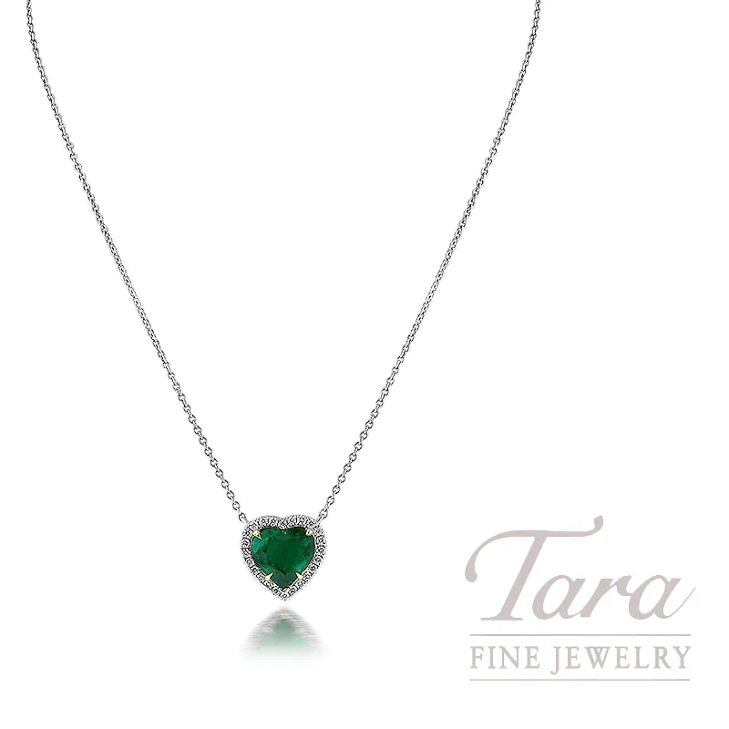 Wonderfully crafted to show off your romantic sense of style, this lovely 18K White Gold Emerald Diamond Heart Necklace will add elegance and style to any outfit. Truly delightful in design and beauty, this gorgeous Necklace is created from 18K White Gold. With an adjustable 16-18″ inch 18K White Gold chain, the Heart Pendant is a mesmerizing 3.20CT Emerald with 18K Yellow Gold prongs, accented by 24 Round Diamonds at 0.34TDW. This romantic and timeless 18K White Gold Emerald Diamond Heart Pendant Necklace is sure to steal your heart!
