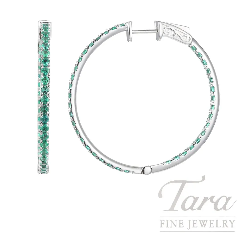 Show the world your dazzling sense of style with these glamorous 18K White Gold Emerald Hoop Earrings! Crafted from radiant 18K White Gold, with 76 lush green Natural Emeralds at 2.08TGW, these lovely Earrings feature an intriguing inside out design. Bask in true brilliance when you don these alluring18K White Gold Emerald Hoop Earrings, as they easily transition from day to night!
