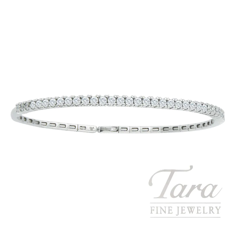 You will love wearing this glowing 18K White Gold Diamond Bangle Bracelet! This lovely Diamond Bangle is crafted from the precious metal of 18K White Gold with 33 Round Diamonds 1.35TDW adorning the Bracelet. The exquisite design of this delicate Diamond Bangle makes it perfect for wearing alone or layering with other beautiful Bracelets.