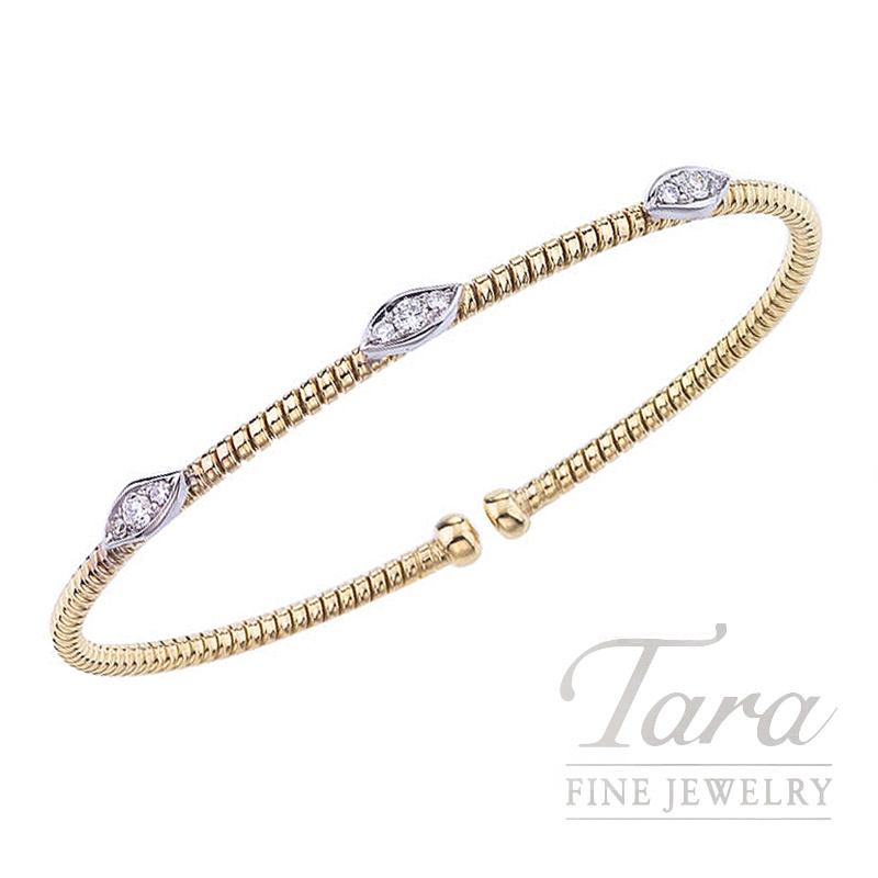 Embrace a world of luxury with this captivating two tone 18K Yellow and White Gold Diamond Bangle showcased at Tara Fine Jewelry Company. This designer Bangle features a unique twisted texture that radiates warmth while providing a modern silhouette for your jewelry collection. Three distinct White Gold Stations are elegantly placed along the band of the Bangle and feature 9 sparkling Round Diamonds at .25TDW. These brilliant Natural Diamonds are expertly set to maximize light reflection and to create a dazzling display of fire with every movement. Lightweight and perfect for stacking, this Diamond Bangle weighs 5.5G, ensuring comfort fit.