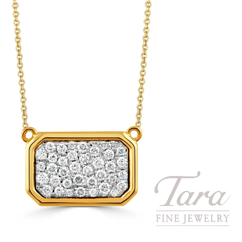 What a charming Diamond Necklace to accentuate your wardrobe! This sophisticated Pave Diamond Necklace is fashioned using the combination of 18K Yellow and White Gold. It features 38 Round Natural Diamonds at 0.35TDW suspended from a 16/18″ Chain. You can never go wrong with a classy Diamond Necklace, and this one is a beauty!