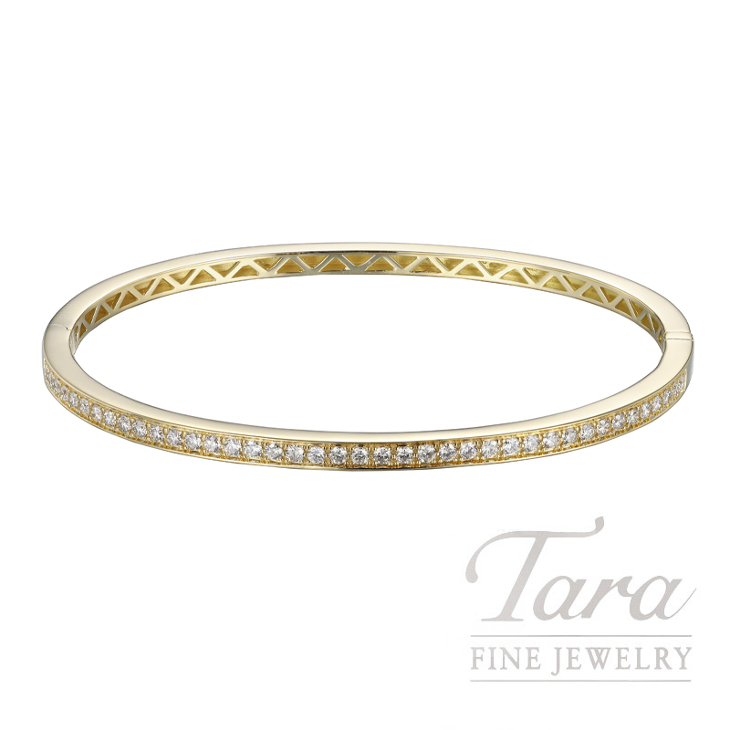 Classic beauty has never been more chic! Fall in love with the remarkable elegance of this incredible 18K Yellow Gold Diamond Bangle Bracelet! A wondrous portrayal of classic style with a modern design, this glorious Bangle Bracelet features gleaming 18K Yellow Gold with 40 Round Diamonds at 0.77TDW. The timeless style and wondrous shimmer of this charming Diamond Bangle make it the perfect accessory for any occasion!