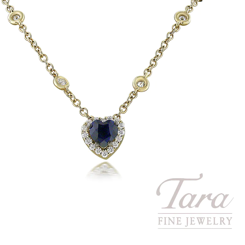 An exquisite Heart Diamond is the focus of this adorable Blue Sapphire Diamond Heart Necklace! This lovely Heart Necklace is crafted from gleaming 18K Yellow Gold. Set in a diamond station pattern, the Necklace features a remarkable Heart Shape Blue Sapphire center stone at 0.53TGW. Experience the embodiment of style and sparkle with this enchanting Blue Sapphire Heart Diamond Pendant Necklace, now featured at your Atlanta Jeweler – Tara Fine Jewelry Company!