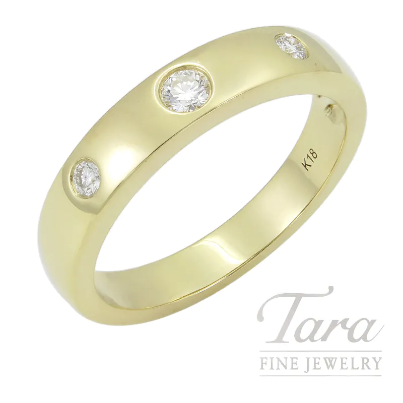 This 18K Yellow Gold Diamond Band showcased here at Tara Fine Jewelry Company, is a testament to minimalist luxury and superior craftsmanship. At 4.29G, this Diamond Ring is designed with a sleek, rounded dome profile. With solid 18K Yellow Gold, the Ring features 3 brilliant cut round Natural Diamonds expertly secured in flush bezel settings. This modern setting not only enhances the contemporary aesthetic but also provides maximum protection for the stones, making it an ideal choice as a wedding band, or a sophisticated everyday statement piece. The high polish finish of the 18K Yellow Gold amplifies the radiance of the Diamonds, creating a seamless flow of light across the surface of the band. With its K18 hallmark visible on the inner shank, this Diamond Gold Ring guarantees authenticity and high purity gold content that resists tarnishing and retains its value over time.