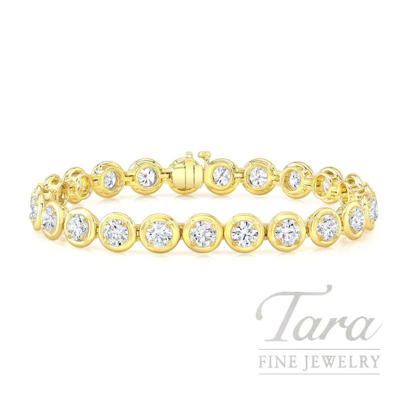 Elevate your collection with this breathtaking 18K Yellow Gold Diamond Bracelet from Tara Fine Jewelry Company. This magnificent Diamond Bracelet showcases 23 brilliant bezel set Round Diamonds at 12.46 carat total diamond weight. Each Diamond is expertly set to maximize sparkle and radiance against the rich warm glow of high quality 18K Yellow Gold. Meticulously crafted with a substantial weight of 25G, this Bracelet offers a luxurious feel and a timeless design that transitions effortlessly from elegant evenings to sophisticated everyday wear. This Diamond Bracelet coordinates perfectly with its matching 18K Yellow Gold Diamond Necklace (*sold separately). Discover the perfect blend of opulence and master craftsmanship with this stunning statement piece that promises to become a treasured heirloom for years to come.