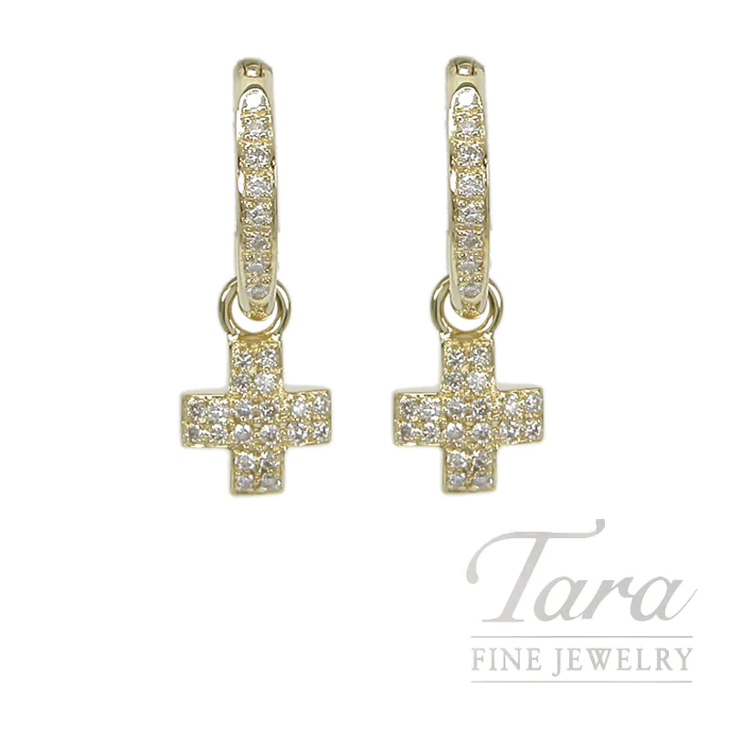 Expertly engineered for both beauty and comfort, these dangle style Diamond Cross Earrings ensure a seamless river of sparkle across the delicate cross motif, while providing durability for daily wear or special occasions. With 96 Round Diamonds at .52TDW, the secure huggie closure offers a comfortable fit against the earlobe, allowing the diamond encrusted cross to dangle with graceful movement.