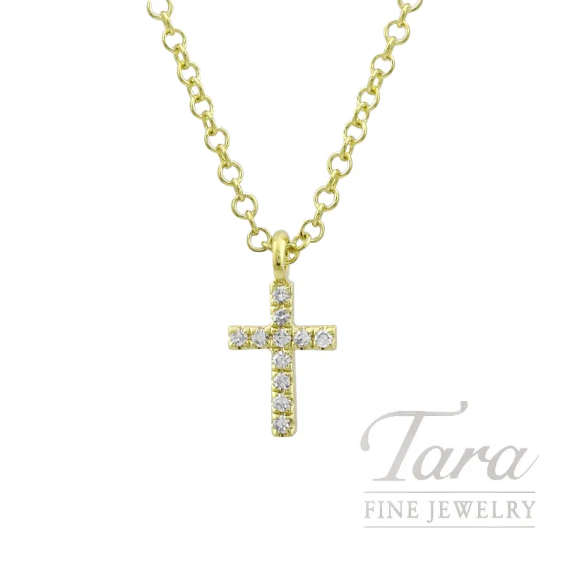 What a beautiful symbol of joy in this 18K Yellow Gold Diamond Cross Necklace, a timeless piece for every jewelry collection! You will adore this beautiful Diamond Necklace crafted from glistening 18K Yellow Gold, with a Diamond Pendant fashioned into a cross design. A true classic, this Diamond Cross Pendant Necklace features 11 Round Diamonds at 0.03TDW. Paired with an adjustable 15-17″ chain included, at 1.82G this wonderful Diamond Cross Pendant Necklace promises to bring everlasting style and sparkle to your fine jewelry collection!
