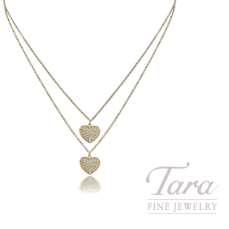 Such a delightful item you will adore the versatility of this whimsical 18K Yellow Gold Diamond Double Heart Necklace. With a duo of Yellow Gold Heart Pendants, the flexible nature of this Diamond Heart Pendant Necklace is maximized with a layered effect all in one Necklace! Set in a pave design with 68 Round Diamonds 0.40TDW, at 5.1G this lovely Diamond Necklace will surround your neckline with beauty and grace!