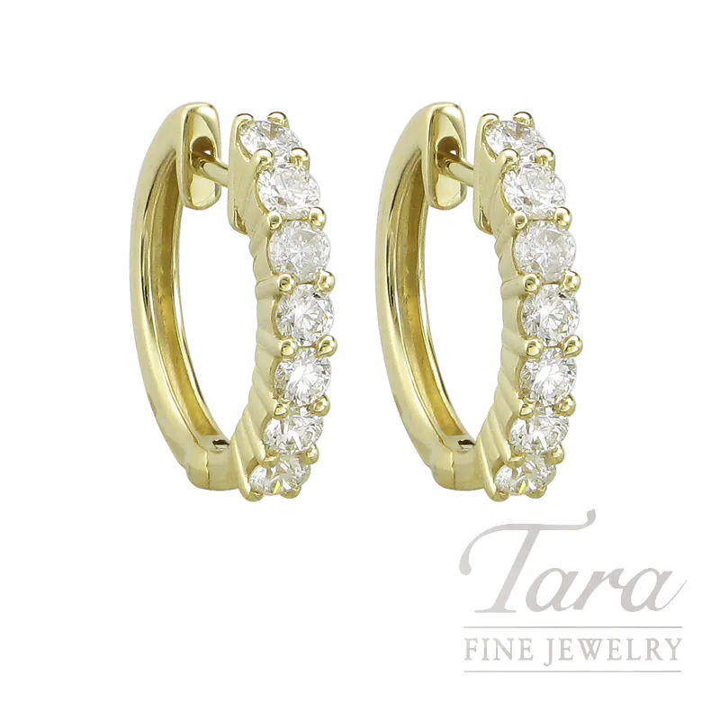 Experience everyday luxury with these dynamic 18K Yellow Gold Diamond Hoop Earrings featured here at Tara Fine Jewelry Company. Expertly designed for a lifetime of brilliance, these Diamond Hoops are crafted from premium 18K Yellow Gold with a radiant finish that beautifully captures and reflects the light. At 2.7G, the Earrings offer a balance of comfort and luxury. Adorned with 14 brilliant Round Diamonds at .62TDW, each Diamond is expertly pavé set to ensure continuous sparkle with every movement.