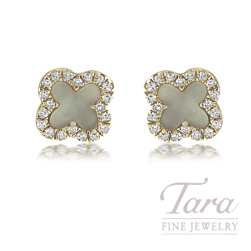 With an aura of femininity, these beautiful 18K Yellow Gold Diamond Mother of Pearl Earrings are a romantic accent for your fine jewelry collection. Crafted into a floral like pattern, at 1.46G, glowing 18K Yellow Gold frames the iridescent Mother of Pearl gemstone at 0.22TGW. To further accentuate the beauty of these lovely Earrings, 40 Round Diamonds create the shimmering outline at 0.10TDW, a joyous Earring for everyday wear!