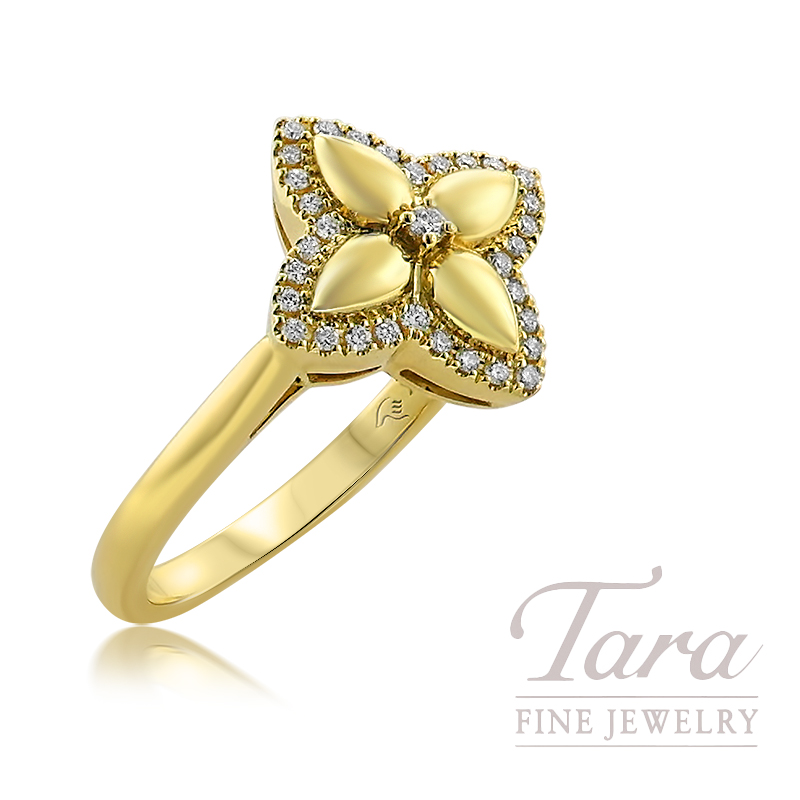 Designed to show a romantic, feminine style, this gorgeous 18K Yellow Gold Diamond Ring will bring luxurious beauty to your jewelry wardrobe! A floral like pattern of 4 gleaming Yellow Gold petals is outlined by 33 Round Diamonds at 0.15TDW. Such a delicate yet delightful Ring perfect for a touch of everyday joy!