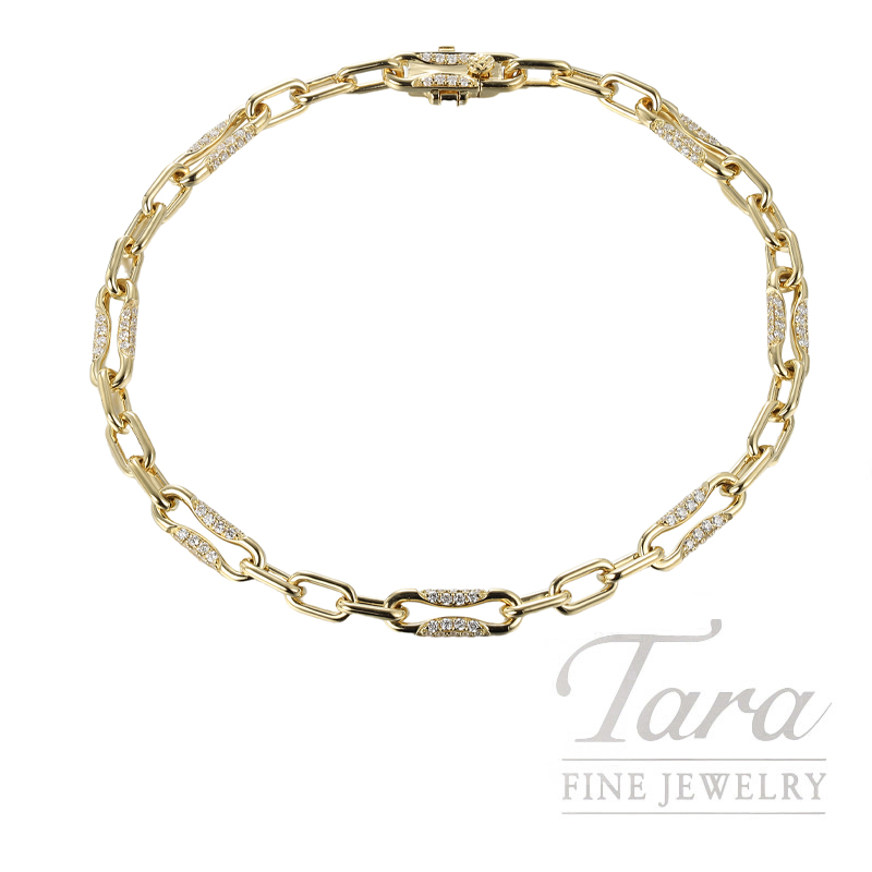 Discover the perfect blend of modern sophistication and timeless luxury with this 18K Yellow Gold Diamond Link Bracelet from Tara Fine Jewelry Company, Atlanta's premier destination for fine jewelry for over 40 years. This contemporary design features high polished links in rich 18K Gold, meticulously accented with pavé-set Round Brilliant Diamonds, on select alternating links, for a refined textured sparkle. This rich 18K Yellow Gold Fancy Link Diamond Bracelet exemplifies the superior craftsmanship and attention to detail in our fine jewelry collections here at Tara Fine Jewelry.
