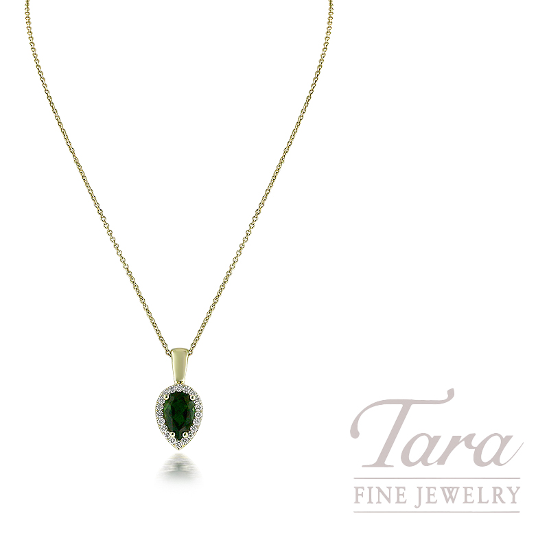 Showcase the allure of this magical 18K Yellow Gold Pear Cut Green Tourmaline Diamond Pendant. This enchanting Green Tourmaline 1.69TGW is a lovely accessory that is sure to radiate with brilliance when fitted with the beautiful Chain of your choice (*sold separately). Framed by a halo of 19 Round Diamonds at 0.24TDW, a gem to treasure for a lifetime!