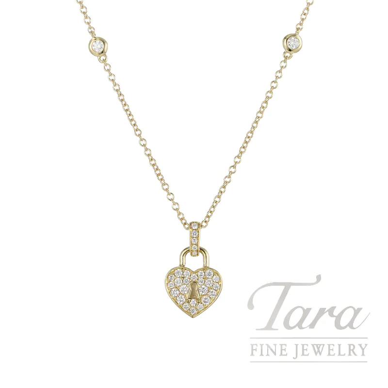 Unlock a world of elegance with this stunning 18K Yellow Gold Diamond Necklace from Tara Fine Jewelry Company. This exquisite Diamond Necklace features a shimmering heart shaped padlock pendant meticulously pavé set with 32 brilliant Natural Round Diamonds at .35TDW and a unique keyhole detail. Crafted from gleaming 18K Yellow Gold, the Necklace is further enhanced by 2 bezel set Round Diamonds along the link chain, adding extra sparkle to every movement. This 4.38G Necklace offers a sophisticated blend of modern style and timeless sentiment. The secure lobster clasp ensures a comfortable fit making it an ideal everyday luxury or a meaningful gift for someone special.