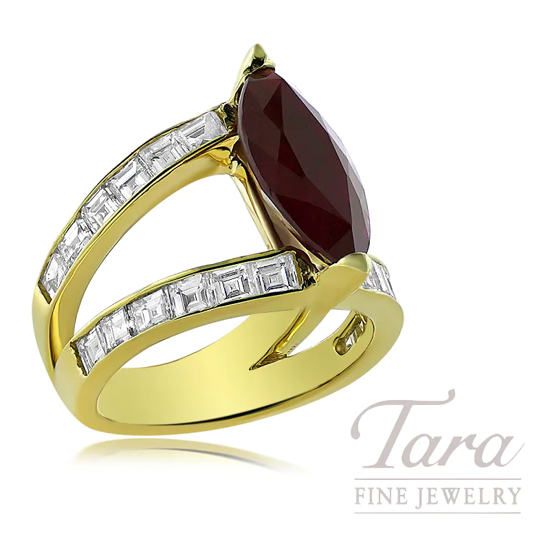 Experience the pinnacle of regal elegance with this magnificent handcrafted Ruby and Diamond ring from Tara Fine Jewelry Company, Atlanta's premier destination for luxury fine jewelry. Designed to commemorate life's most remarkable accomplishments, this masterpiece transforms a simple day into a majestic occasion. At the heart of this timeless classic lies a generous 4.17CT Marquis Cut Ruby, radiating a deep, soulful crimson. This stunning center stone is framed by a shimmering halo of 24 Asscher Cut Diamonds, all meticulously set in rich, polished 18K Yellow Gold.